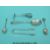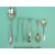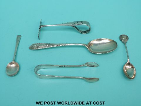 A hallmarked silver pusher, hallmarked silver tongs and three silver spoons (77g)