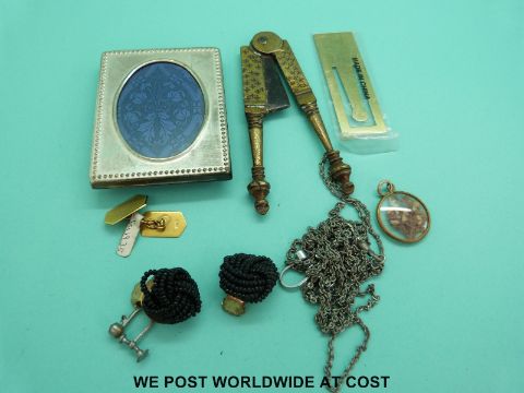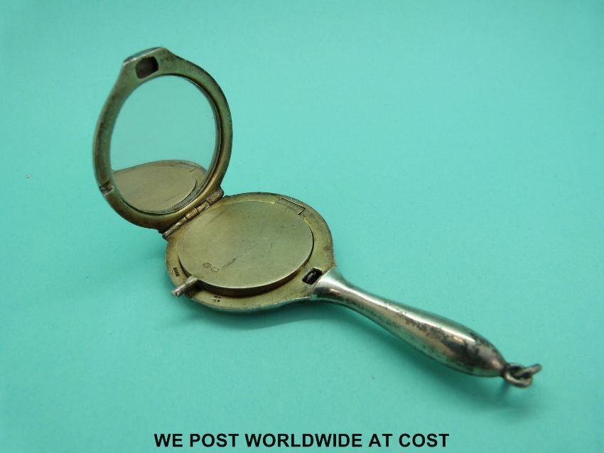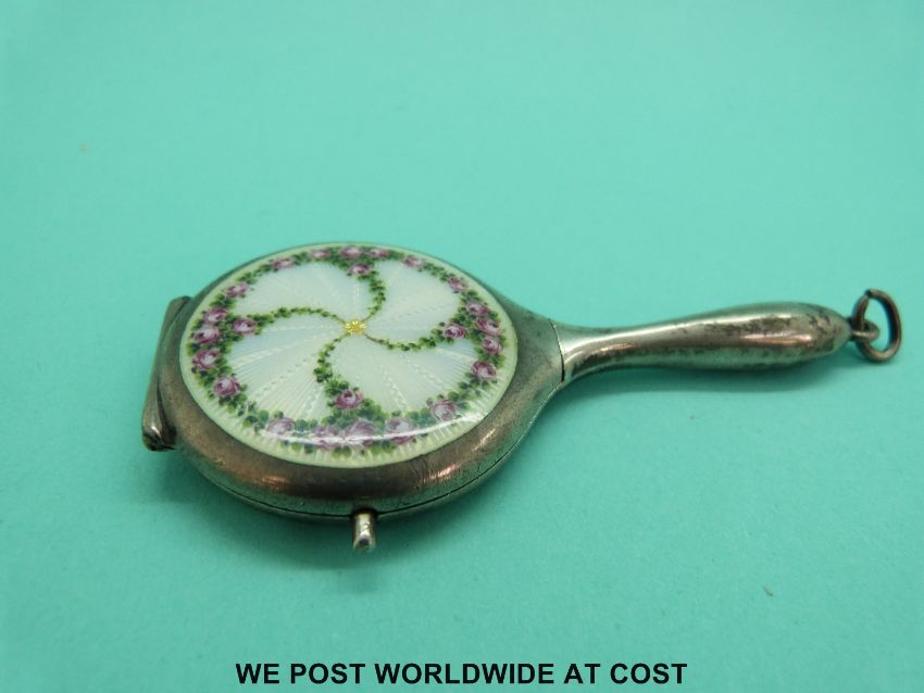 A continental silver and guilloche enamel compact in the form of a hand mirror, the spring loaded enamel cover opening to reveal a circular mirror and separate hinged powder compartment. With importer's mark for Erich Kellerman and import marks for London 1909, together with a 9ct gold cufflink, costume jewellery etc.