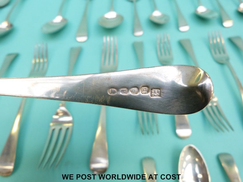 A Georgian Old English pattern 12 place setting canteen of cutlery comprising 12 each of table spoons, length 22cm, dinner forks 20cm, dessert spoons 17.5cm, London 1810 maker William Eley, William Fearn & William Chawner; dessert forks, length 16.5cm London 1810 maker's mark WE and teaspoons length 13.5cm, London 1810 maker William Eley and William Fearn (2380g) together with 12 each of dinner and dessert forks, length 24 and 21cm respectively, by Roberts Belk Ltd. with silver handles, Sheffield 1966