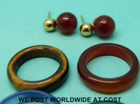A pair of carnelian earrings and rings including tigers eye, carnelian agate, jadeite and blue agate