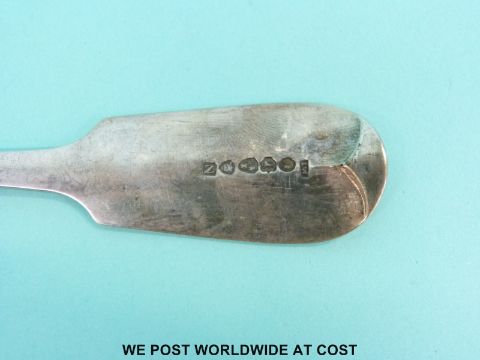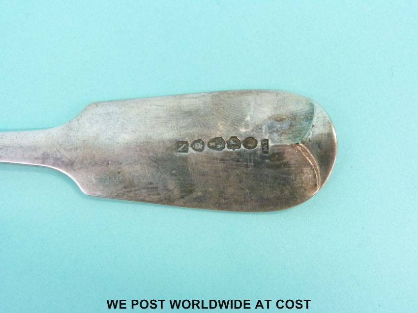 A pair of Georgian Newcastle hallmarked silver fiddle pattern table spoons, Newcastle 1803, maker possibly John Walton, length 22cm (127g)