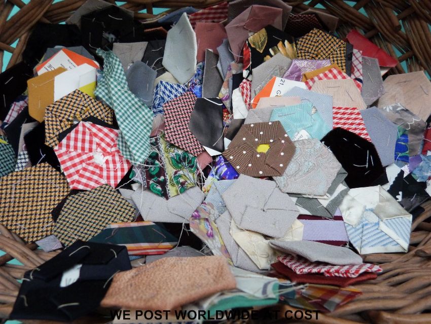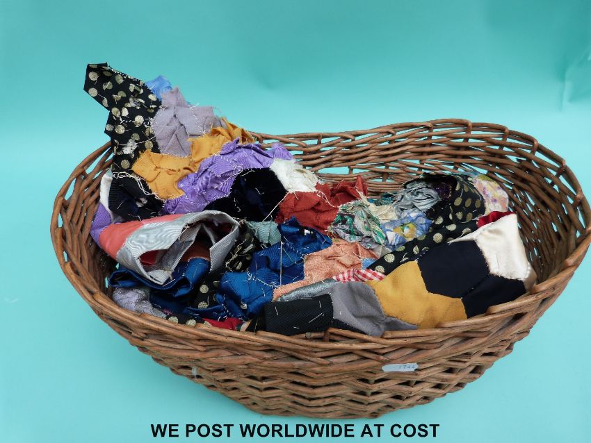 A basket containing a part finished patchwork quilt made up from hexagon shaped pieces in various colours and designs, size approximately 113x156cm