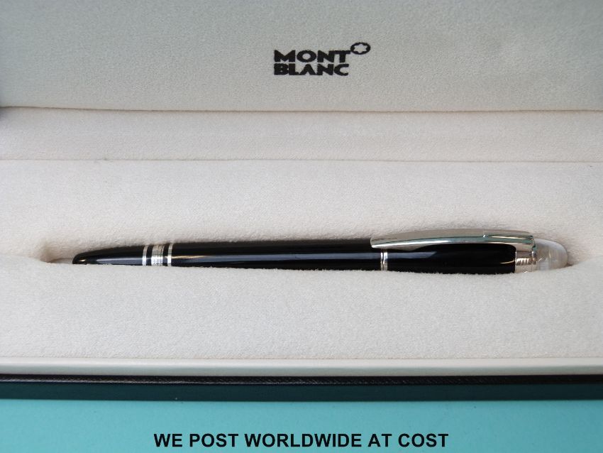 Montblanc fountain pen with black resin barrel and cap, chrome fittings and 18ct gold nib, in original box with service manual and packaging.