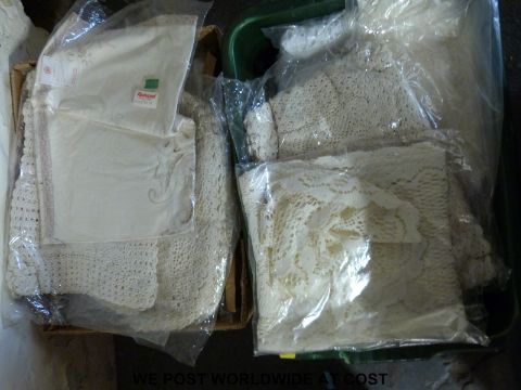 Four boxes containing a large quantity of table runners and similar furniture covers etc.