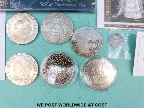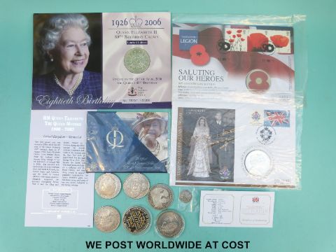 Ten various five pound coins including 90th anniversary poppy, Queen's Jubilee, William and Catherine 2011, 1558-2008 Queen Elizabeth, 1926-2006 Queen's 80th birthday (two designs), 1900-2002 Queen Elizabeth the Queen Mother, and 2008 anniversary of Lord Nelson's birth together with an 1850 Swiss 10 cent piece