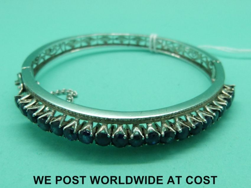 A white metal bangle set with a row of round cut sapphires with pierced design verso (21.3g)