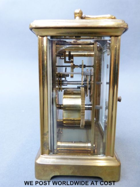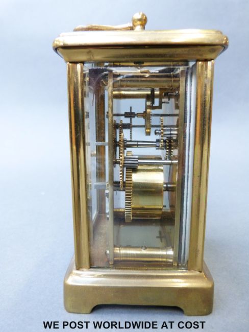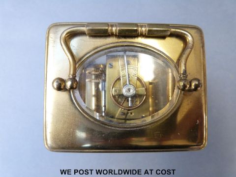 A late 19th early 20th century brass carriage clock by Paris maker, the white enamelled dial with Roman numerals inscribed by the retailer Snow and Ashworth Harrogate, 10cm tall