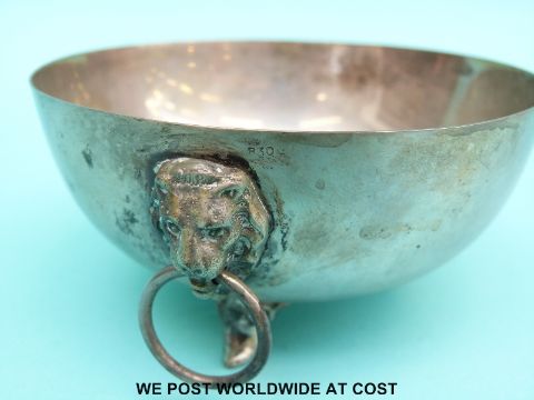 Continental white metal bowl with lion mask handles, stamped 830, width 11cm (100g)
