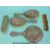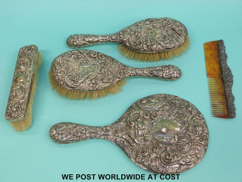 An Edwardian hallmarked silver mounted dressing table set comprising hand mirror, two hand brushes and a comb all with embossed decoration including faces, Birmingham 1906/7 and a further silver mounted brush