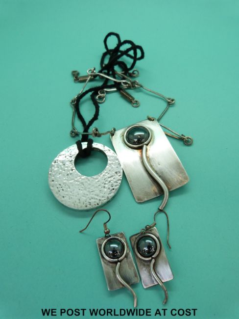 A white metal necklace and matching earrings set with hematite and another silver pendant