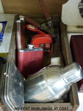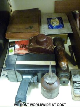 A quantity of collectables to include Videomaster Sportsworld vintage games console, telescope, camera, printing plates, clock, stencils, retro flip phone etc.