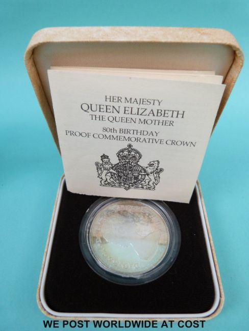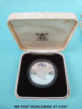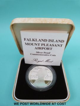 Three commemorative silver proof crowns to include a 1985 Falklands Mount Pleasant airport example