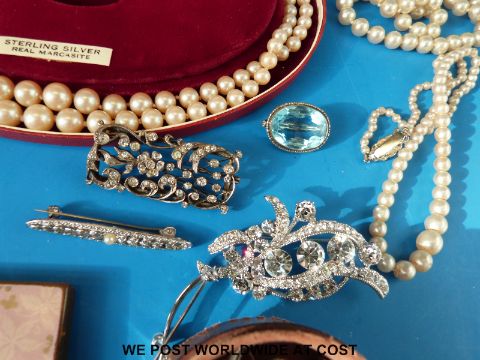 Four strands of faux pearls, studs, two compacts, silver brooches, ivory button hook etc.