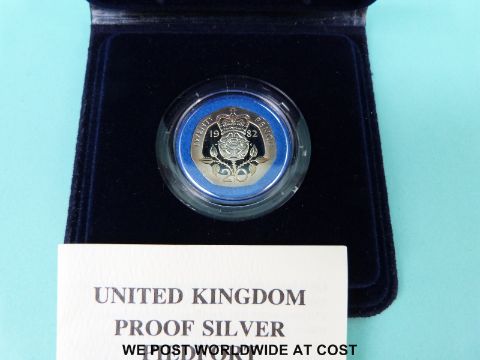 Three cased silver proof piedfort coins comprising 1992-93 50 pence, a 1999 £1 and a 1982 20 pence