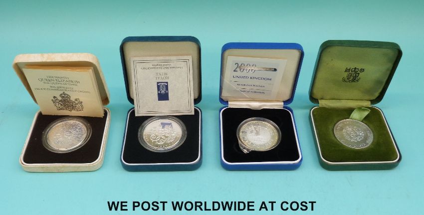 Four silver commemorative crowns 1972, 1980, 1990, and 2000 all cased, three with certificates