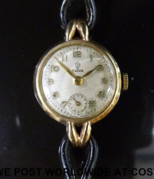 Tudor 9ct gold ladies wristwatch with inset subsidiary seconds dial, gold hands and Arabic numerals, in Rolex case, on black leather strap, case diameter 21mm.
