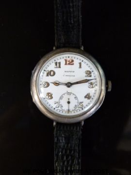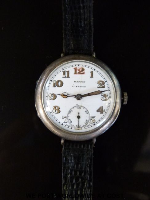 Mappin & Webb Campaign silver gentleman's military officers wristwatch with inset subsidiary seconds dial, luminous hands and numerals and white enamel face, on black leather strap, case diameter 35mm, in original fitted box.