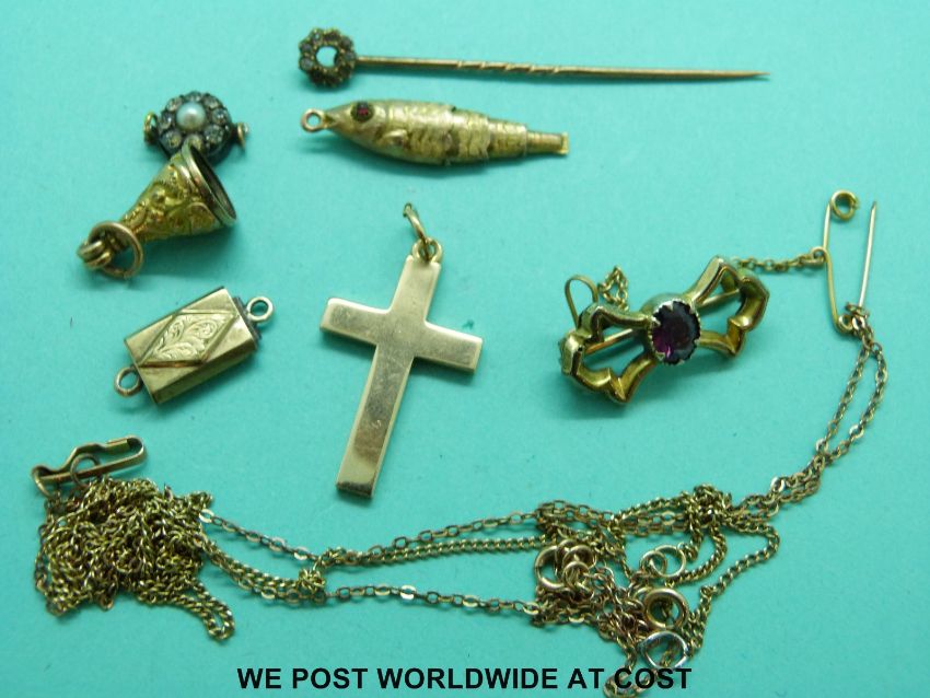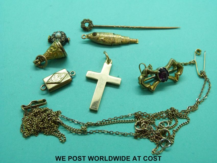 A yellow metal brooch in the form of a bow set with an amethyst (2.5g), a hallmarked 15ct gold cross (3.8g), yellow metal stick pin set with diamonds, yellow metal chains (3.4g) etc