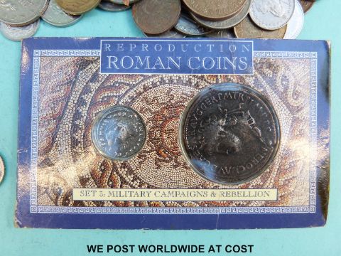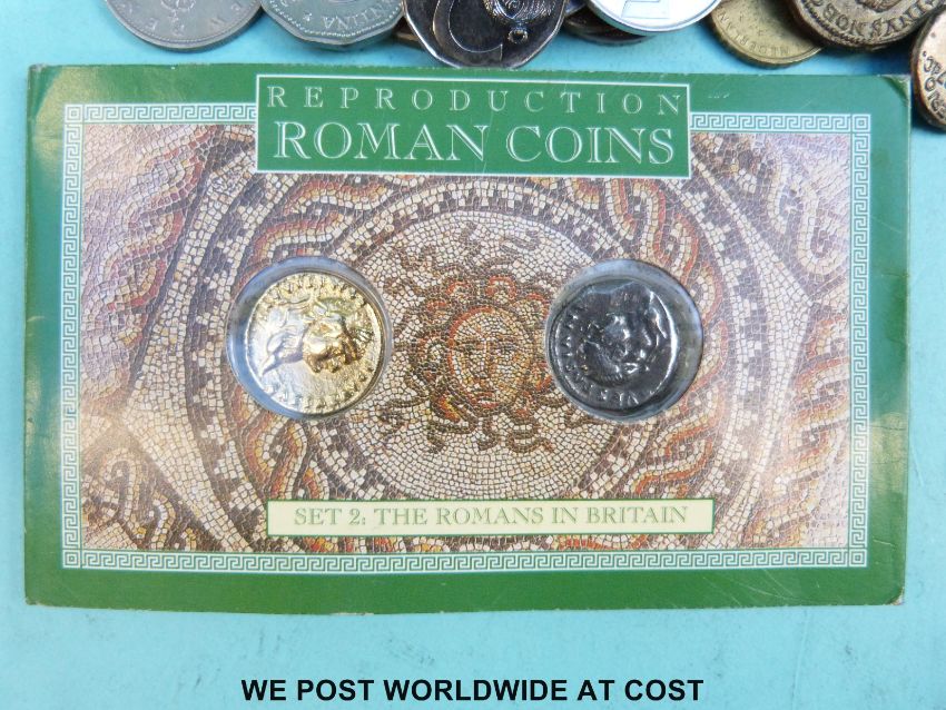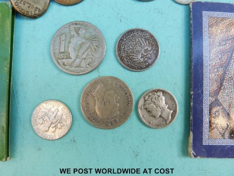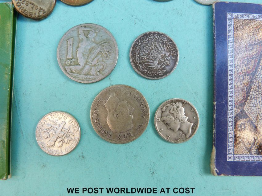 A collection of overseas coinage together with a 1950 visitor's badge Berlin Parliament, very small silver content