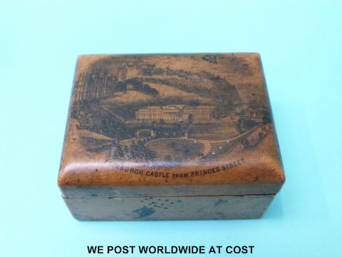 A carved treen snuff box/needle case in the form of a keep or rook chess piece and a Mauchline ware box, Edinburgh Castle from Princes Street