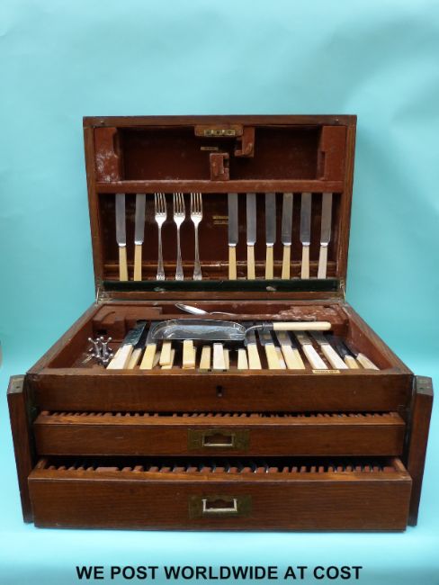 A Mappin and Webb oak canteen, part filled with cutlery