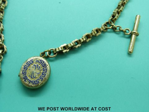 A 9ct gold Albert made up of unusual shaped links with textured surface and a Victorian locket with enamel decoration (27g)