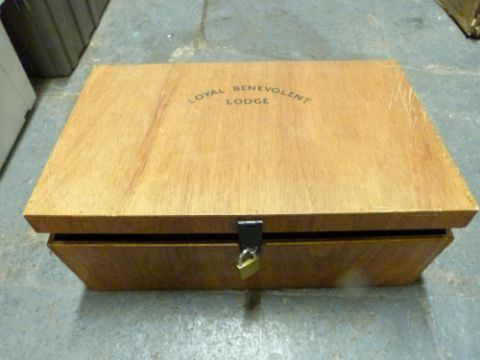Wooden trunk and a wooden box marked Loyal Benevolent Lodge, possibly Masonic