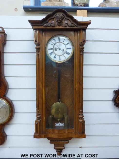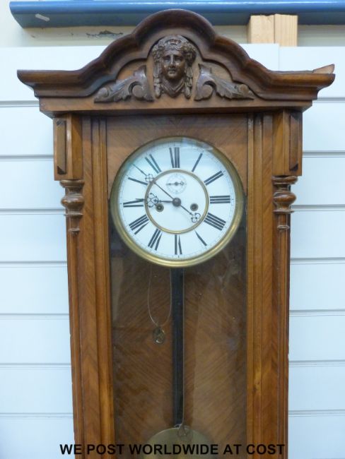 A 19th century Vienna regulator wall clock in walnut case the two train movement striking on a gong, enamelled dial with double gilt chapter ring bezels and Roman numerals with stylized hands