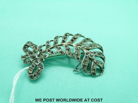 A white metal feather brooch set with paste