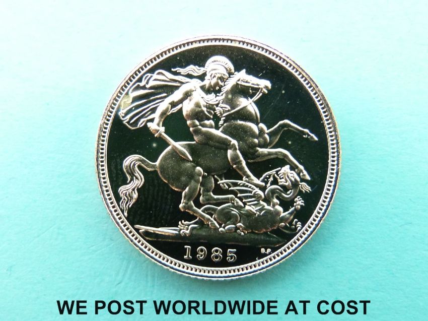 A 1985 proof gold full sovereign cased