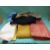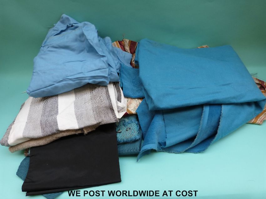 A box containing fabric suitable for clothes/dress making to include off-cuts of blue cord material, various colours of lining material and a bag of various threads