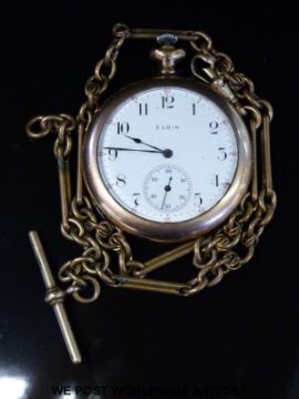 Elgin gold plated gentleman's pocket watch with 15 jewel movement numbered 11657751, Arabic numerals and screw case back, on a yellow metal chain with elongated links, case diameter 48mm.