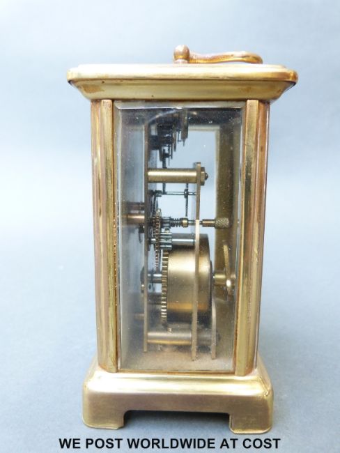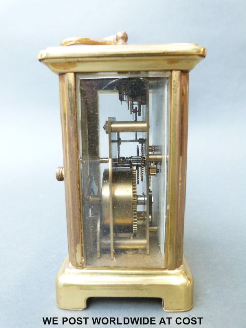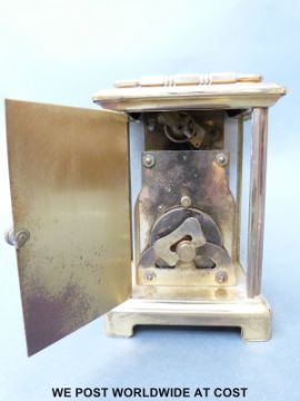 A late 20th century French brass carriage clock with Roman numerals to enamelled dial, the 8 day keyless movement by Duverdrey and Bloquel, 12cm tall
