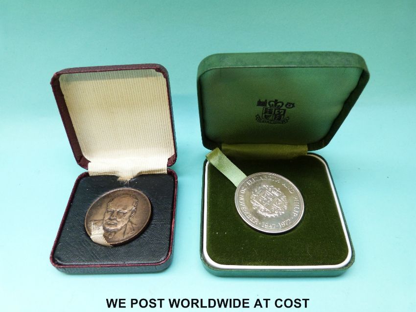 A collection of coins to include a silver example and a Winston Churchill medal together with a further quantity of modern crowns to include a 1953 Coronation