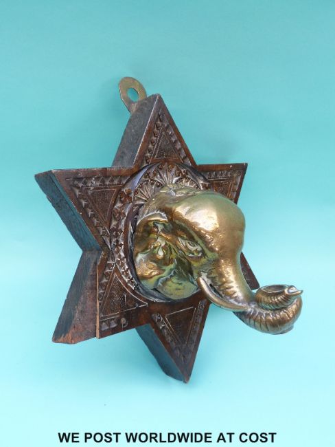 A 19th/20th century Anglo Indian brass elephant bust mounted on a carved star shaped plaque, possibly an architectural fitting, height 28cm