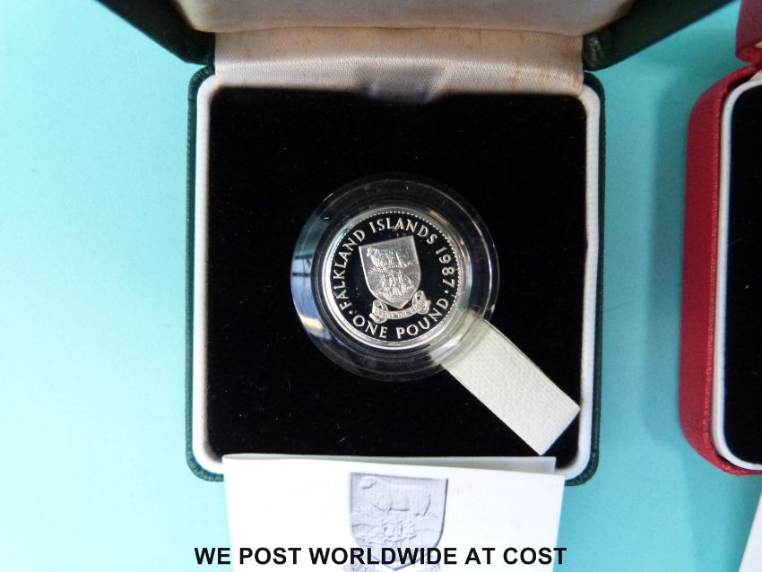 Two cased silver proof Piedfort £1 coins comprising a 1987 Falklands example and 1988 UK emblem, both with certificates