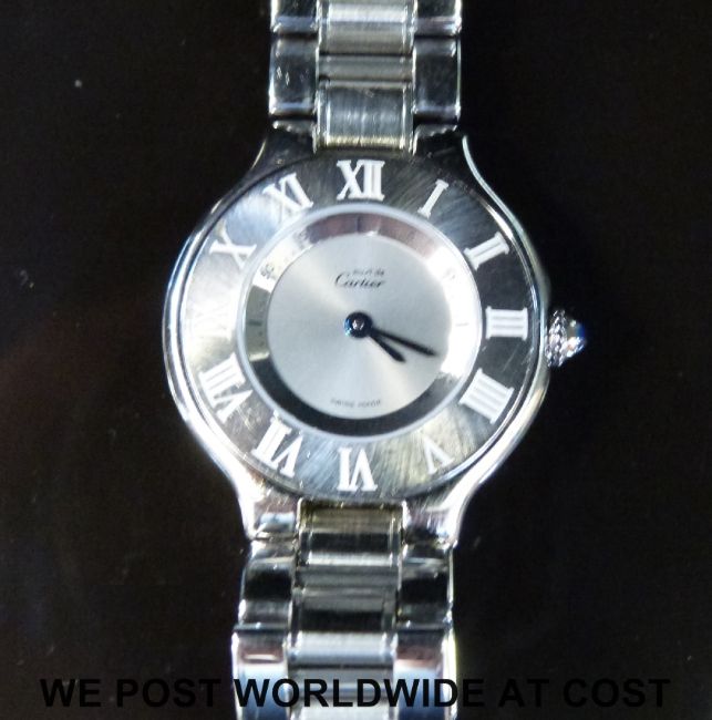 Must de Cartier ladies wristwatch with blued hands, sapphire set winder and Roman numerals to the broad bezel, on stainless steel bracelet, case diameter 22mm, in original case with outer box, certificate and guarantee.