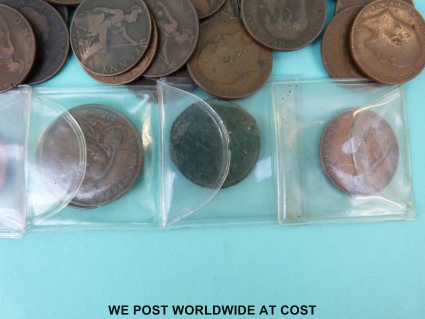 A collection of Georgian, Victorian and Edwardian etc copper coinage, includes near VF cartwheel twopence, George II examples, Victorian bronze penny, half farthing, William IIII with lustre etc