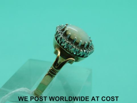 A 9ct gold ring set with an oval opal cabochon surrounded by diamonds (size M)