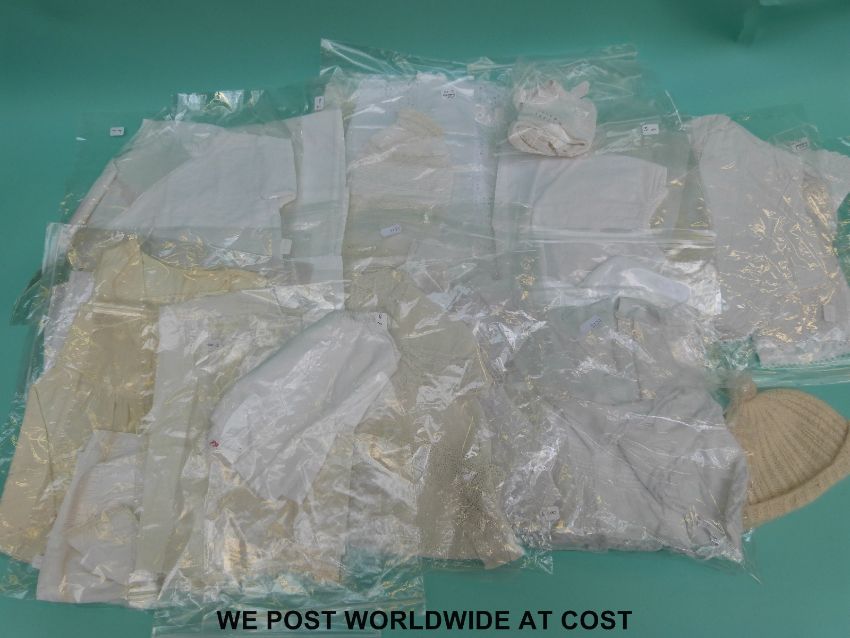 A quantity of late Victorian/Edwardian babies matinee jackets, some examples with lace decoration finish to the edges and cuffs together with a knitted bobble hat
