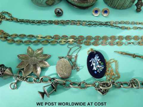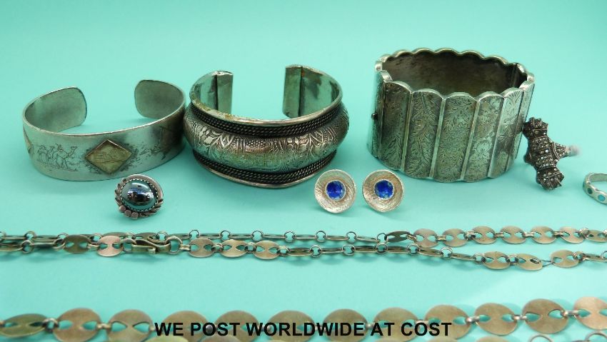 A silver ring set with marcasite, silver brooch, three white metal bangles, silver locket etc