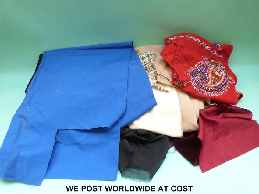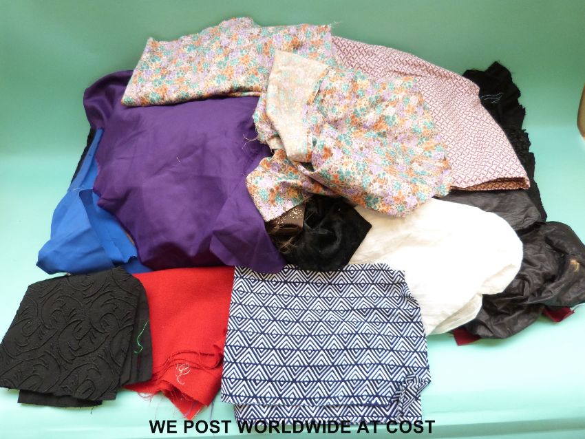 A box of material for fabric making to include off cuts of lining material, plain and flower decoration etc.