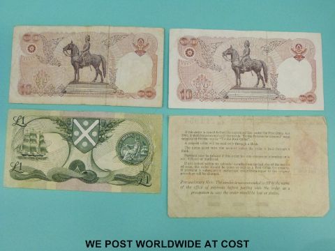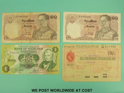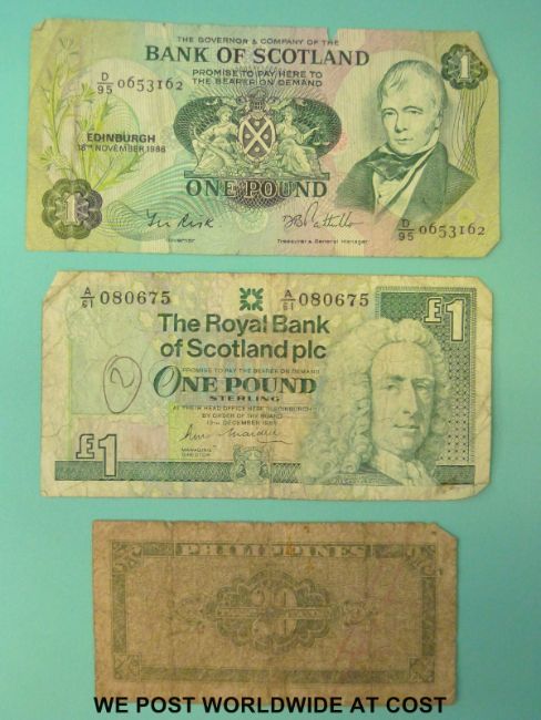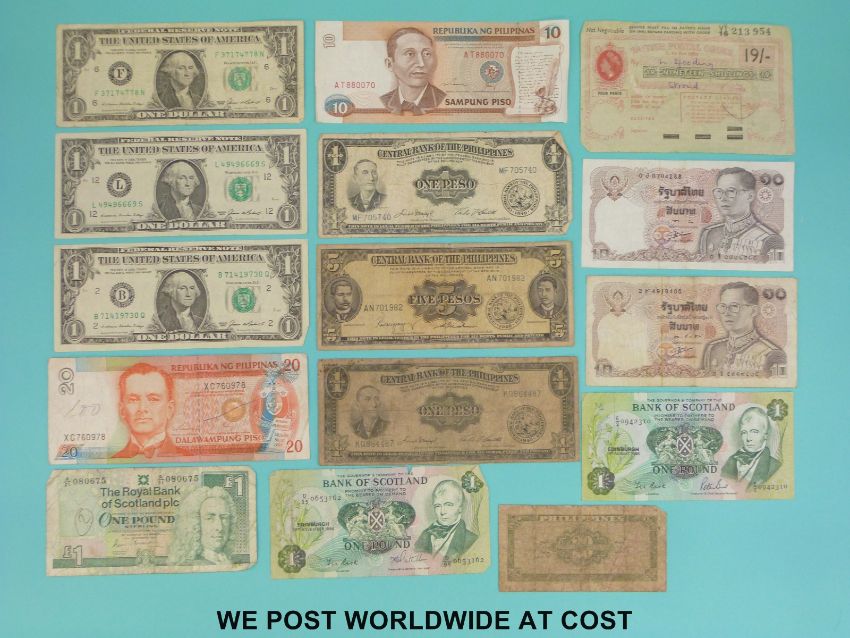 A collection of various world bank notes to includes USA, Scotland, Philippines etc.