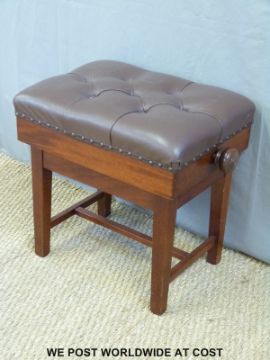 A leather Chesterfield and mahogany piano stool with adjustable height, width 52cm
