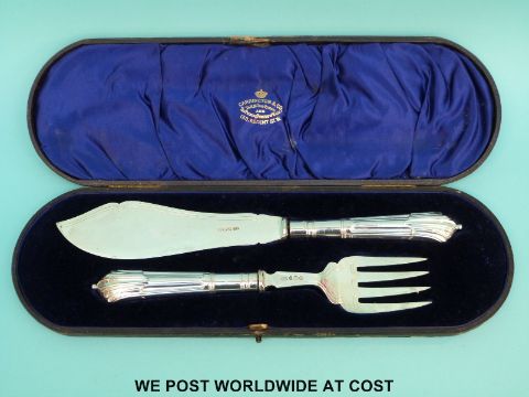 A Victorian Carrington & Co. cased fish server set with hallmarked silver blade, tines and handles, Sheffield 1897, length of knife 30cm (weight of both 241g all in)
