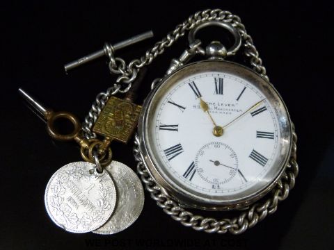 H Samuel Manchester Acme Lever silver pocket watch with inset subsidiary seconds dial, Roman numerals, gold hands and white enamel face, on graduated hallmarked silver chain mounted with a coin and a local interest token, case diameter 50mm, in original box with service receipt.