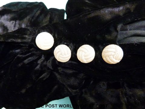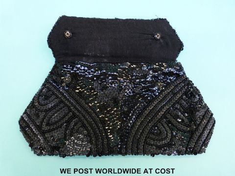 A 1930/40's black velvet evening or cocktail dress with button shoulders and matching bead work purse