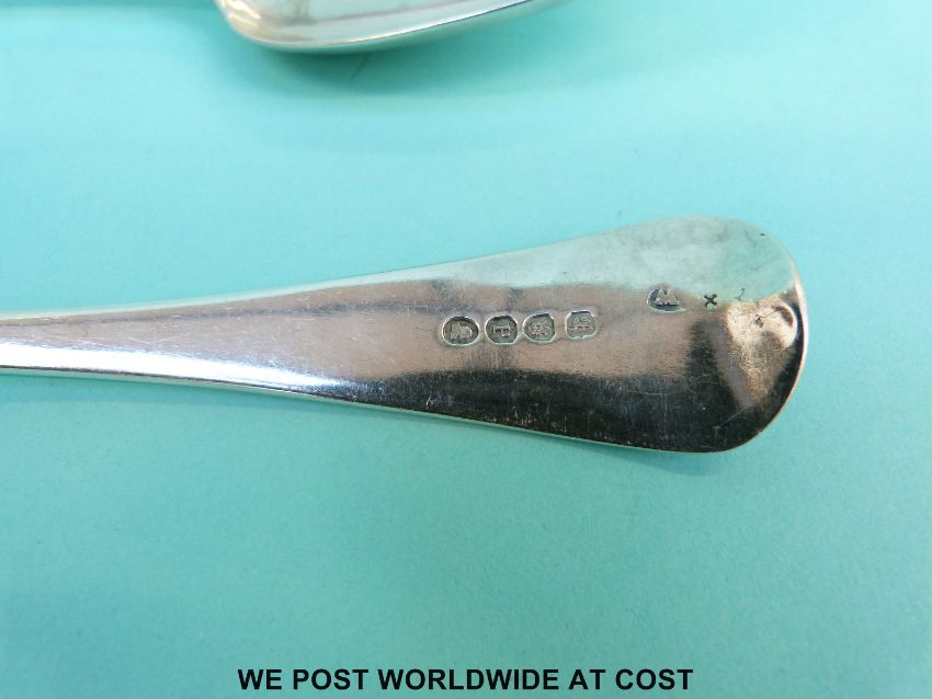 Three various Georgian hallmarked silver tablespoons, length 21.5cm (196g)