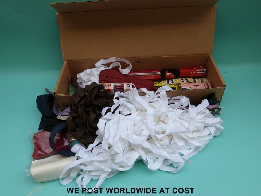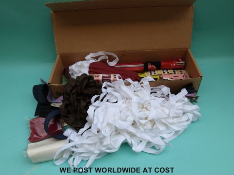 A box containing a quantity of fabric for dress making to include various lining material, an off cut of sequinned material together with a box of zips and cuffs etc.