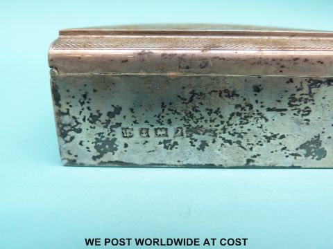 A hallmarked silver Art Deco style engine-turned cigarette box, Birmingham 1958 maker's mark rubbed